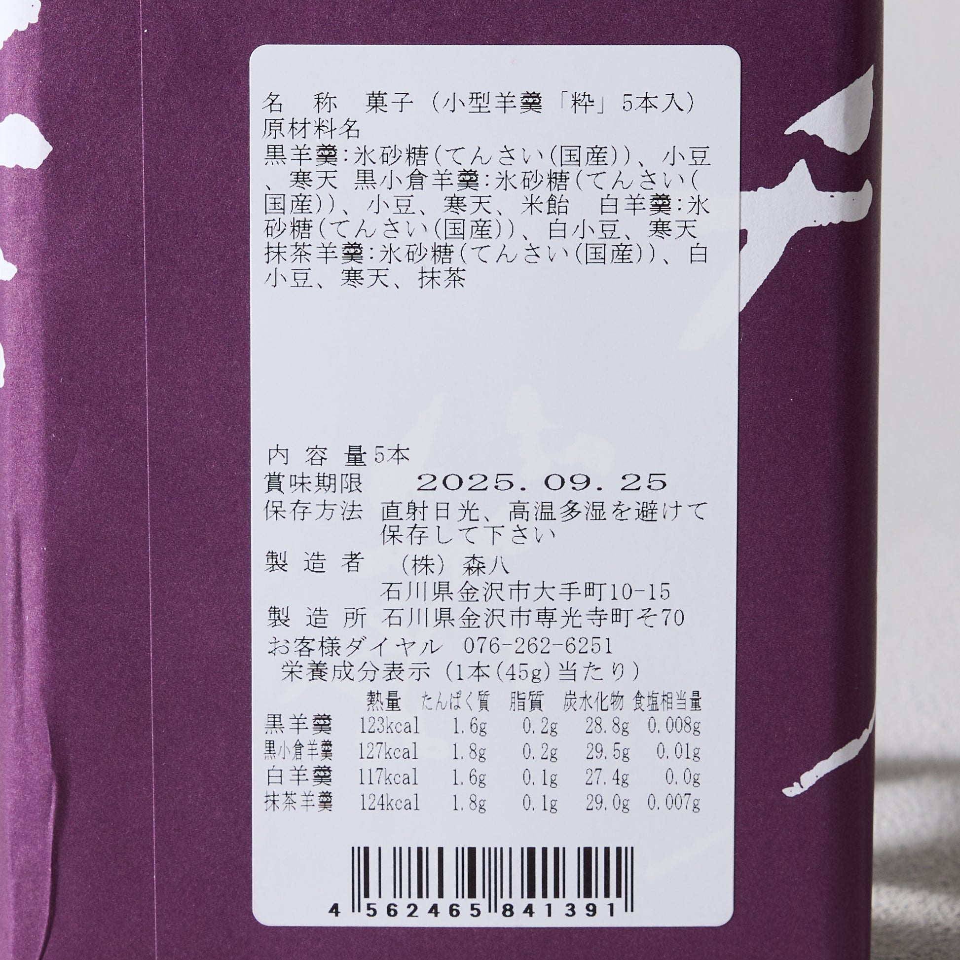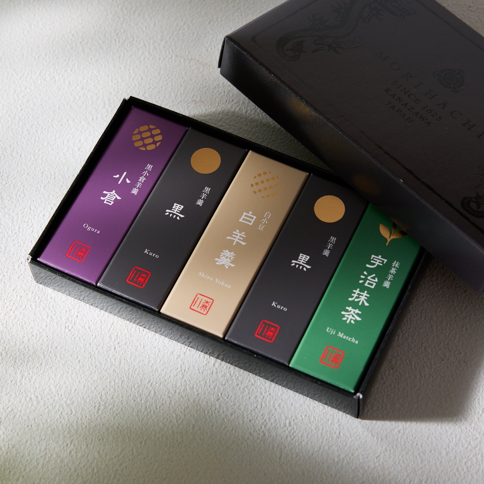 Note: The box contains 2 pieces of Black Yokan, 1 piece of Black Ogura Yokan, 1 piece of White Yokan, and 1 piece of Matcha Yokan flavors.
