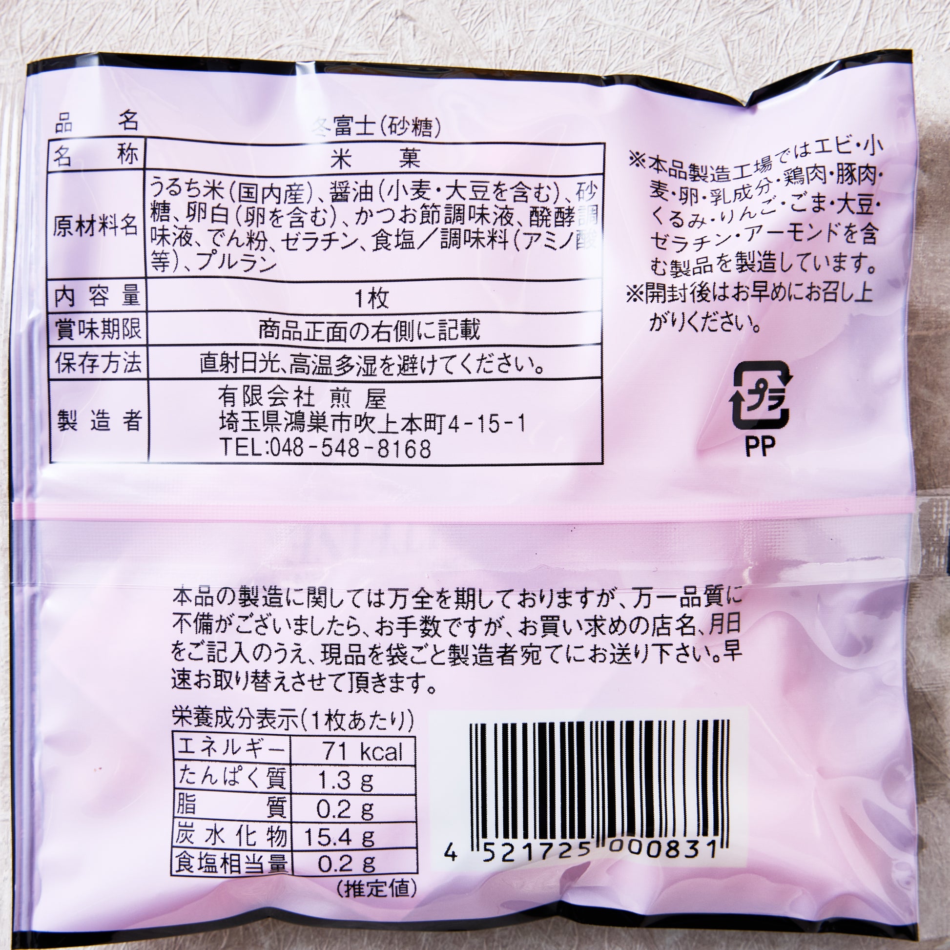 Delicately balanced between savory and sweet, these crisp rice crackers are crowned with a dusting of fine sugar, evoking the serene beauty of Mount Fuji’s snow-capped summit.