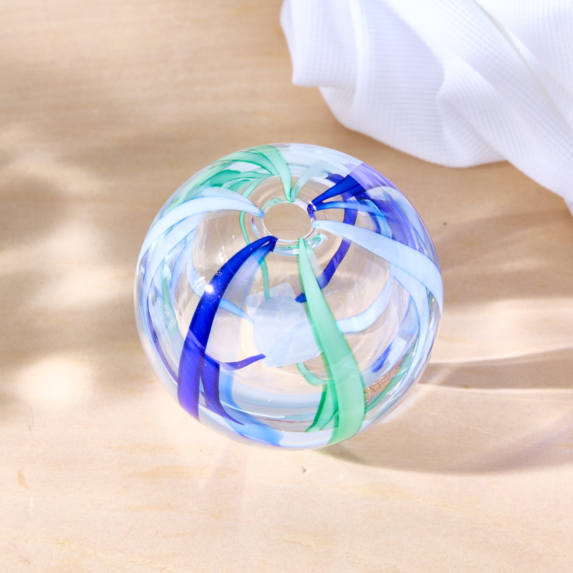 Part of the Iro Temari (手鞠) series, the design takes inspiration from traditional temari—colorful embroidered balls—echoing the vivid patterns and changing palettes of the seasons. Each piece is handblown by Tsugaru Vidro, a glassmaker with over 50 years of expertise. Rooted in the traditions of Aomori Prefecture, their work is known for its vibrant colors and refined craftsmanship.