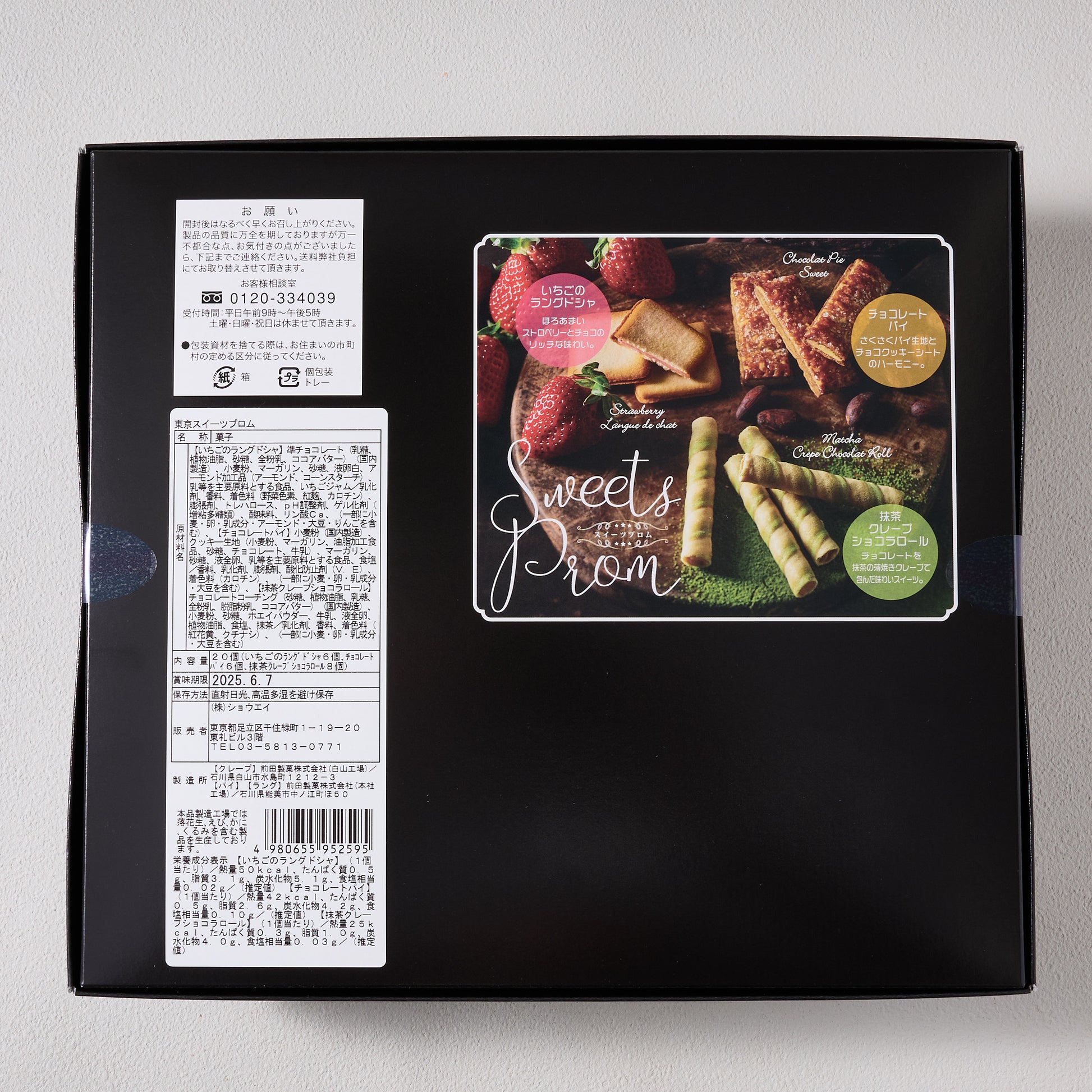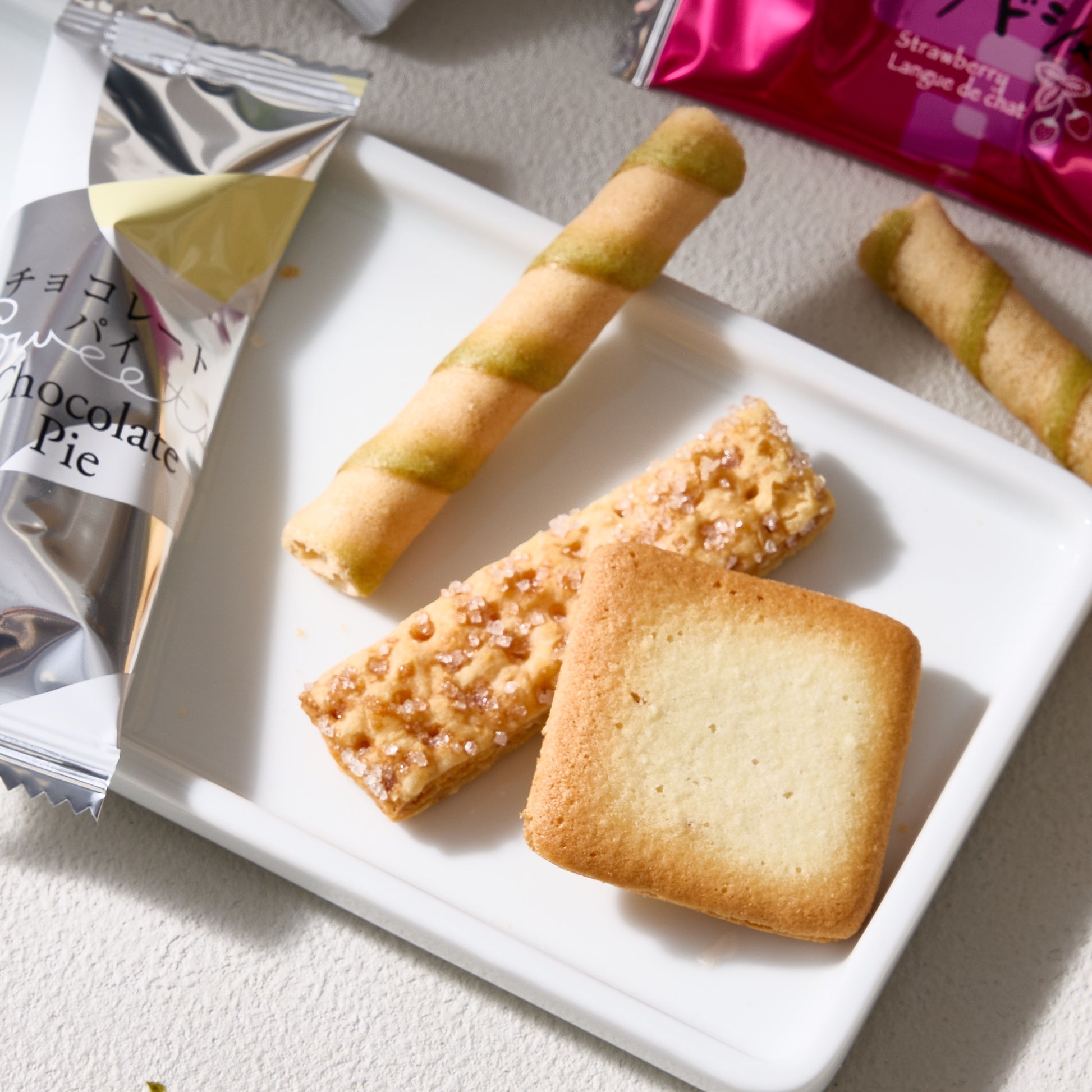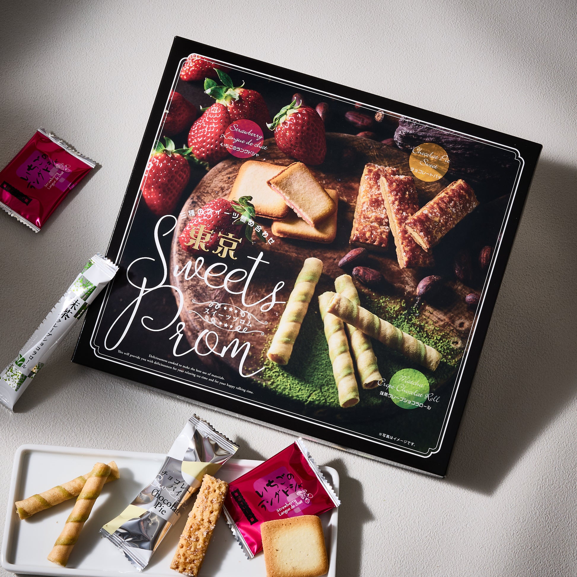 Indulge in the delectable flavors of this sweets assortment, featuring strawberry langue de chat, chocolate pie, and matcha crepe chocolate rolls.
