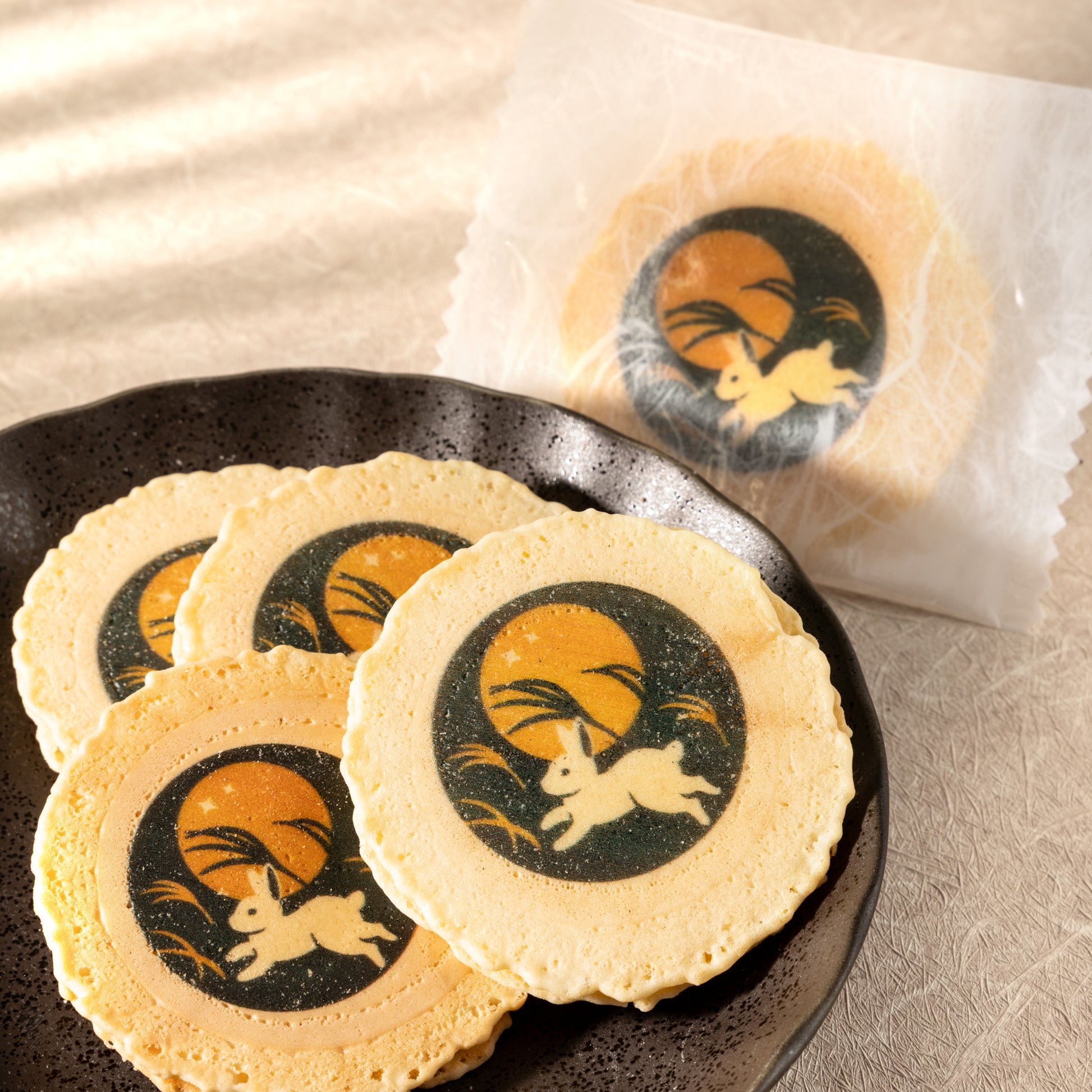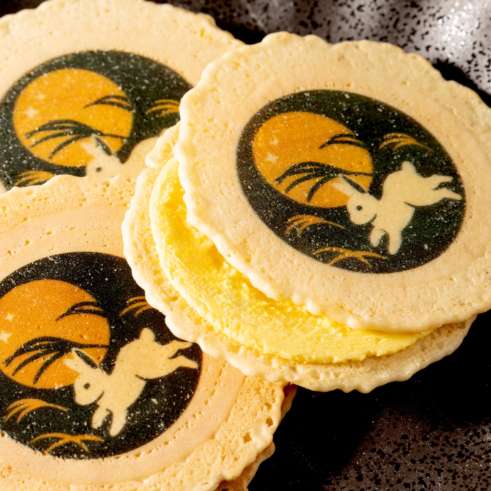 Smooth mikan-flavored cream is sandwiched between crisp, thinly baked cookies adorned with the captivating design of rabbits under the full moon. Pleasantly sweet and tart, they pair perfectly with a cup of tea.