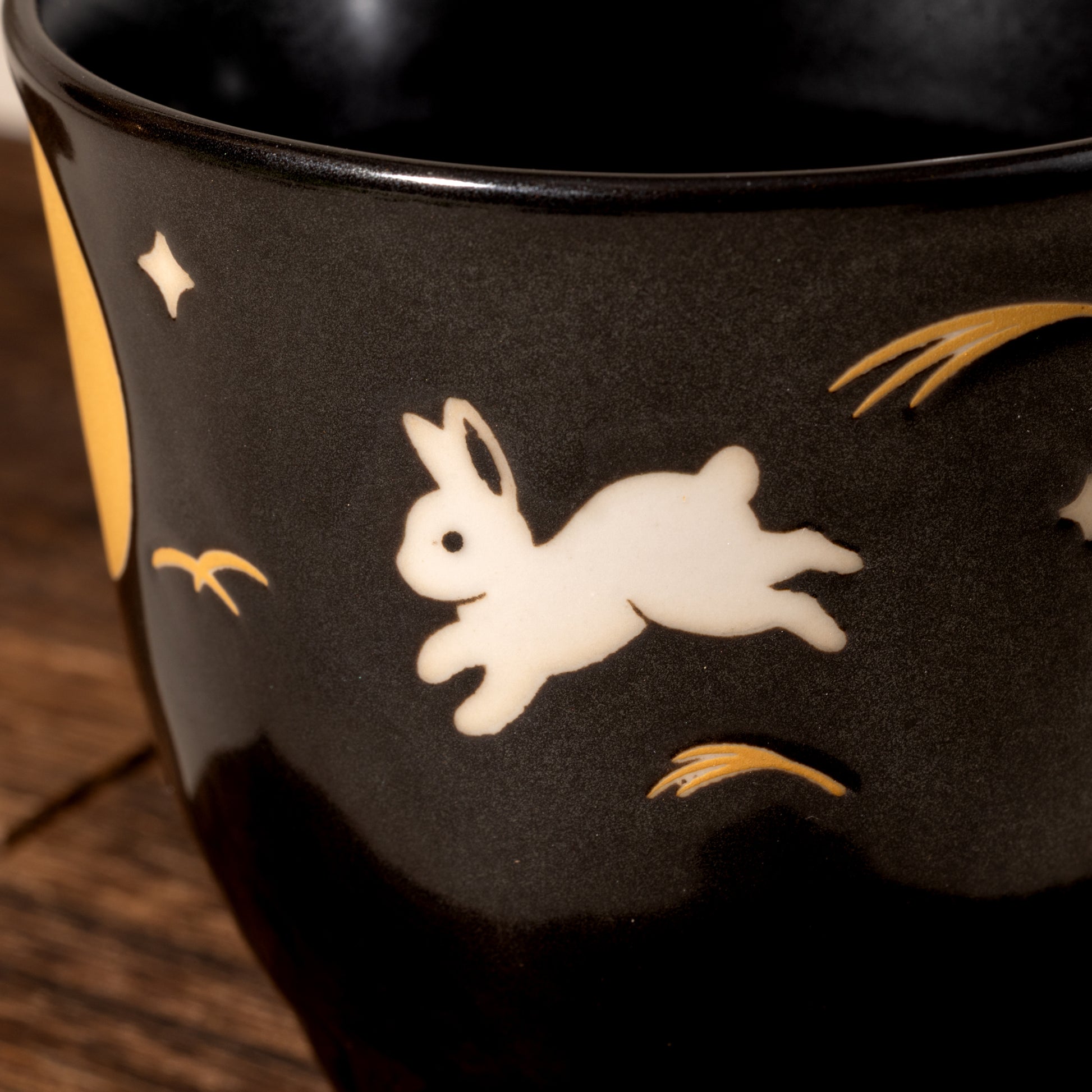 Celebrate the quiet beauty of Tsukimi with this elegant yunomi teacup, crafted by artisans at Bloom in Gifu, Japan. Made using traditional Mino ware techniques, the cup features a charming moon-viewing rabbit motif against a deep black glaze, evoking the serenity of autumn nights. Its gently contoured form fits comfortably in the hand, offering both aesthetic refinement and everyday ease.