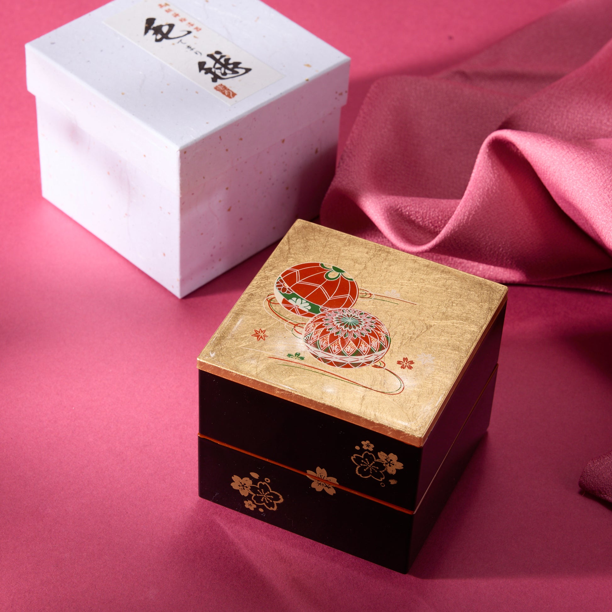 This exquisite Yamanaka lacquerware box is adorned with gold and silver leaf, meticulously crafted using the maki-e method—a traditional Japanese lacquer technique. A delicate temari (手毬) design—colorful embroidered balls used as decorative accessories—adorns the lid, while elegant sakura blossoms align seamlessly across the two tiers, creating a harmonious composition.