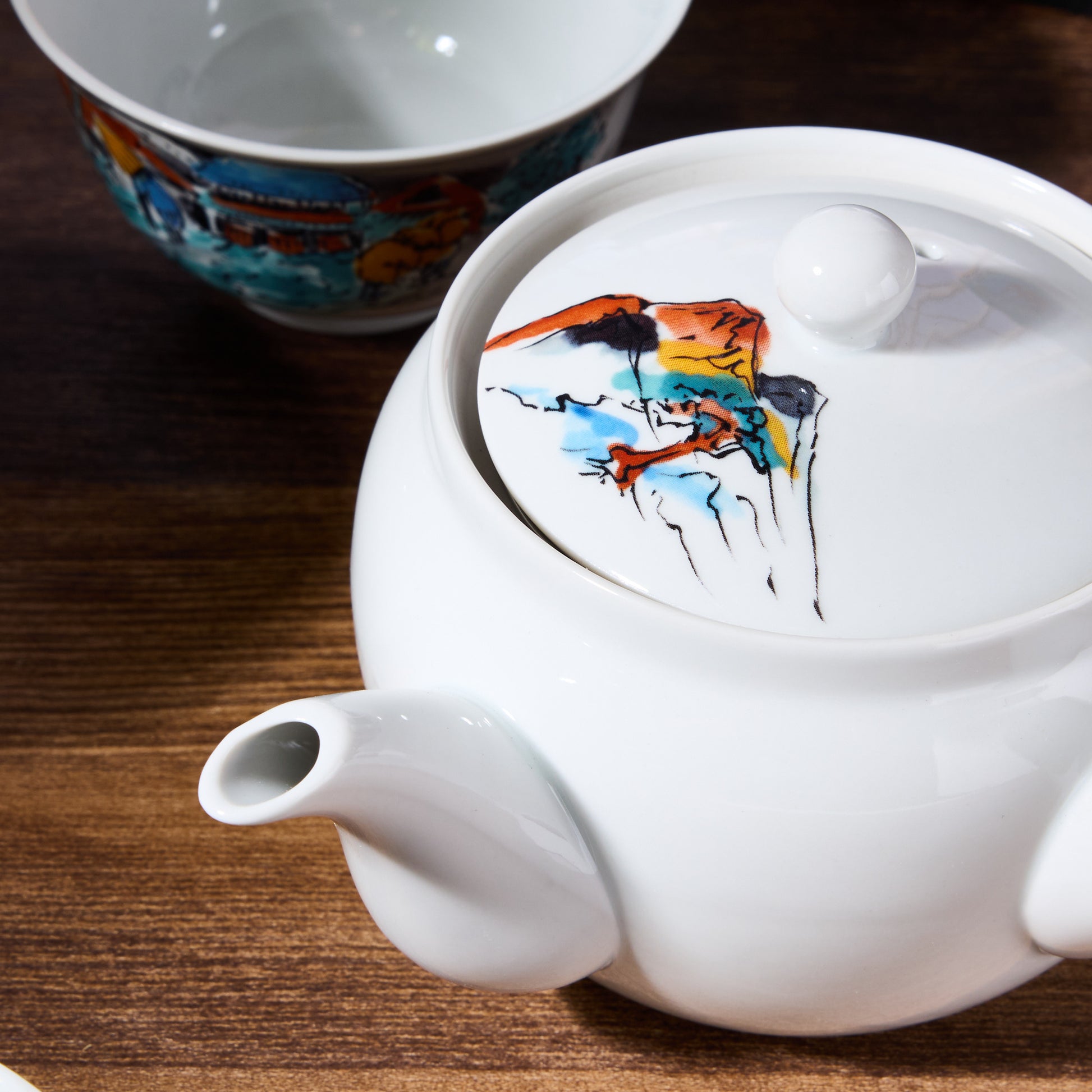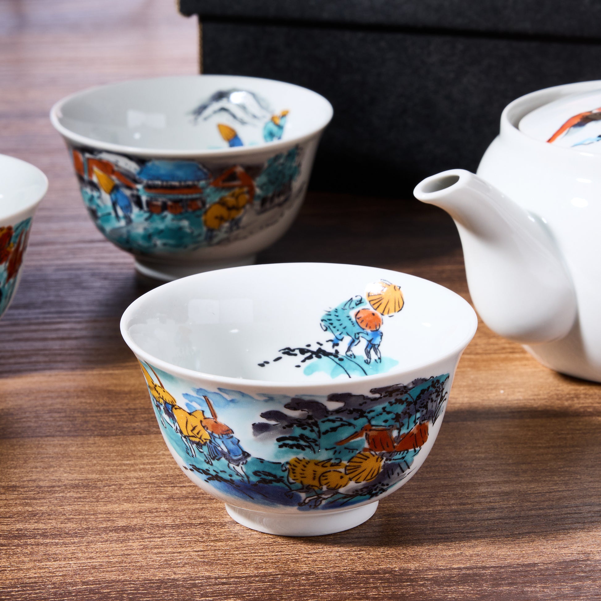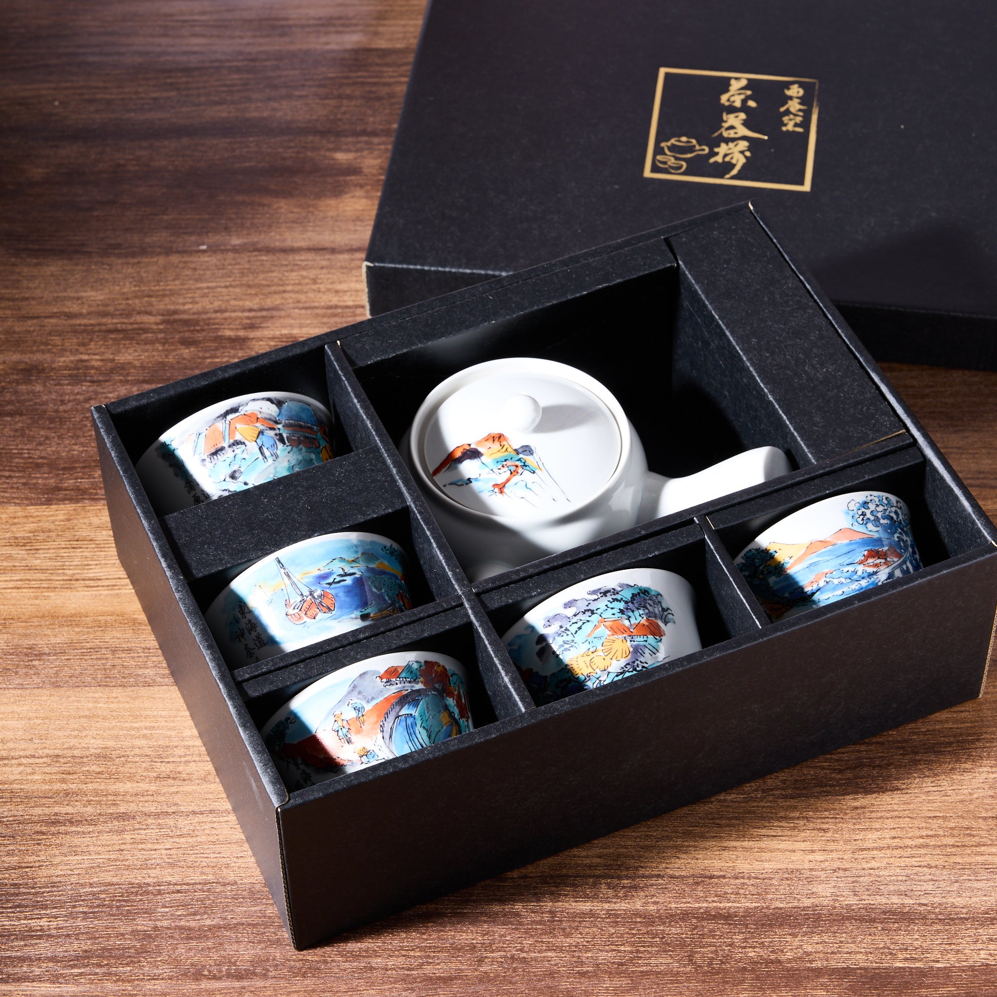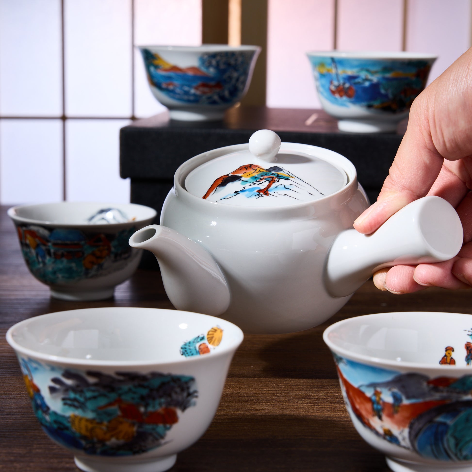 This exquisitely detailed set features a Kyusu teapot and five distinct teacups, each inspired by a scene from the world-renowned Japanese artist Utagawa Hiroshige’s iconic The Fifty-Three Stations of the Tōkaidō ukiyo-e prints.