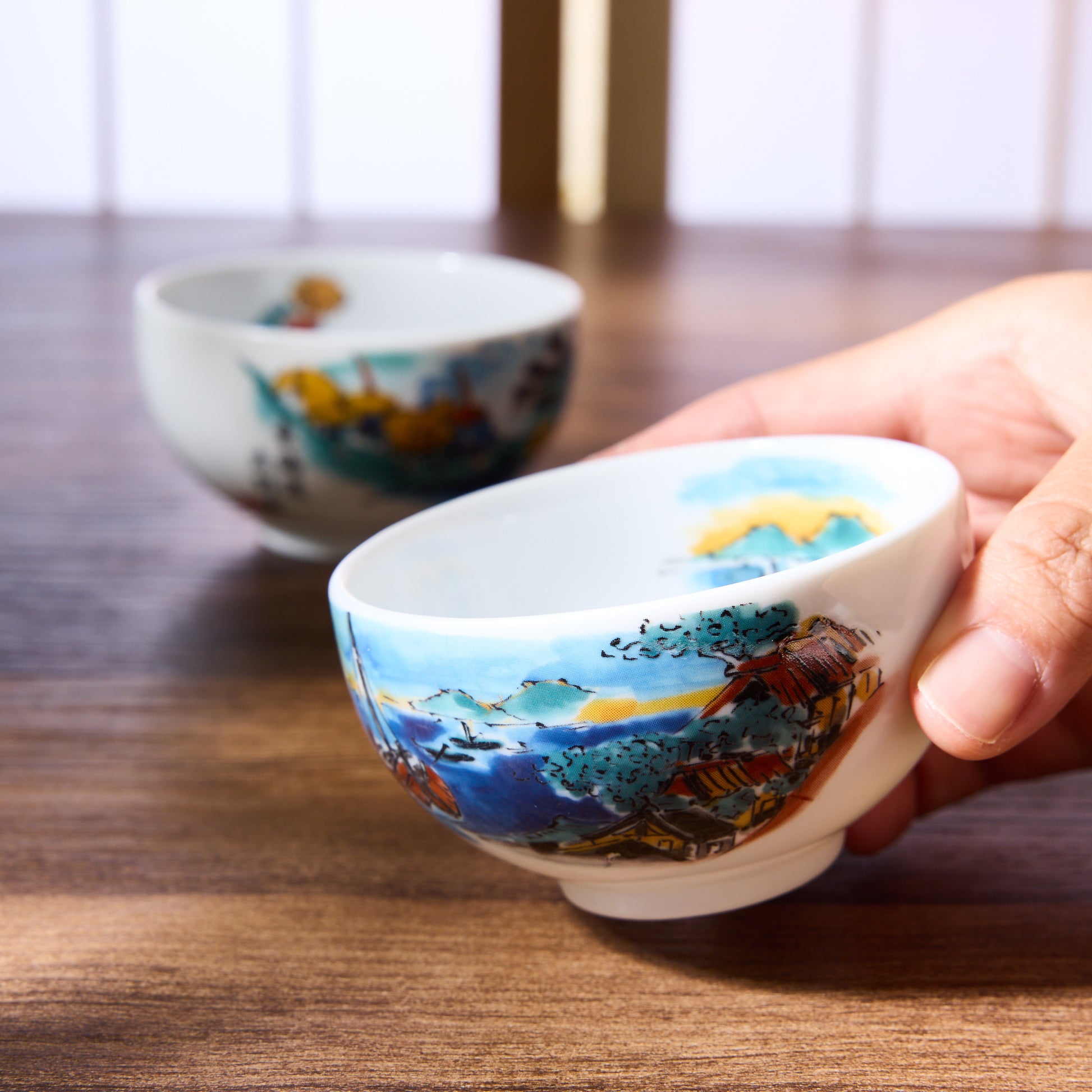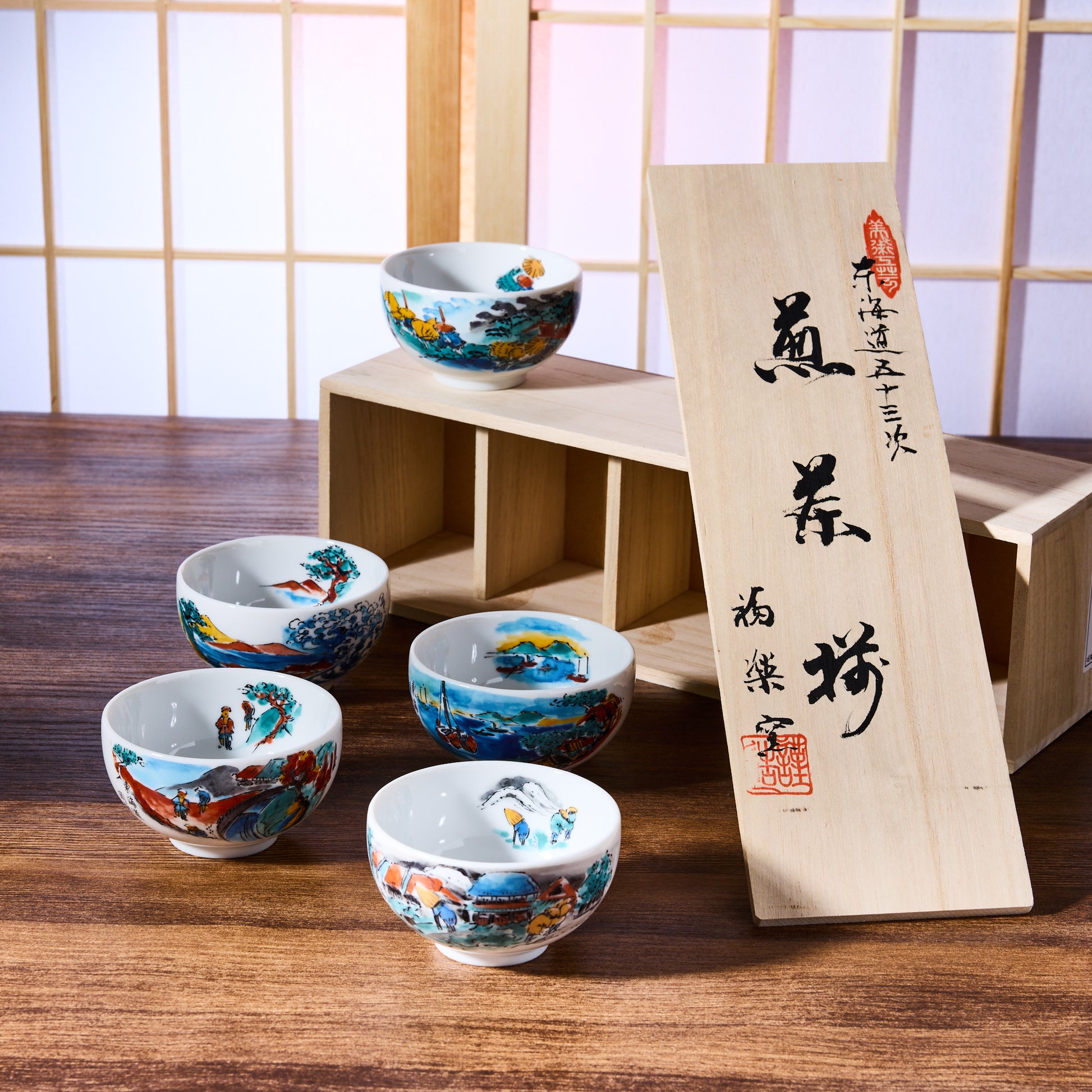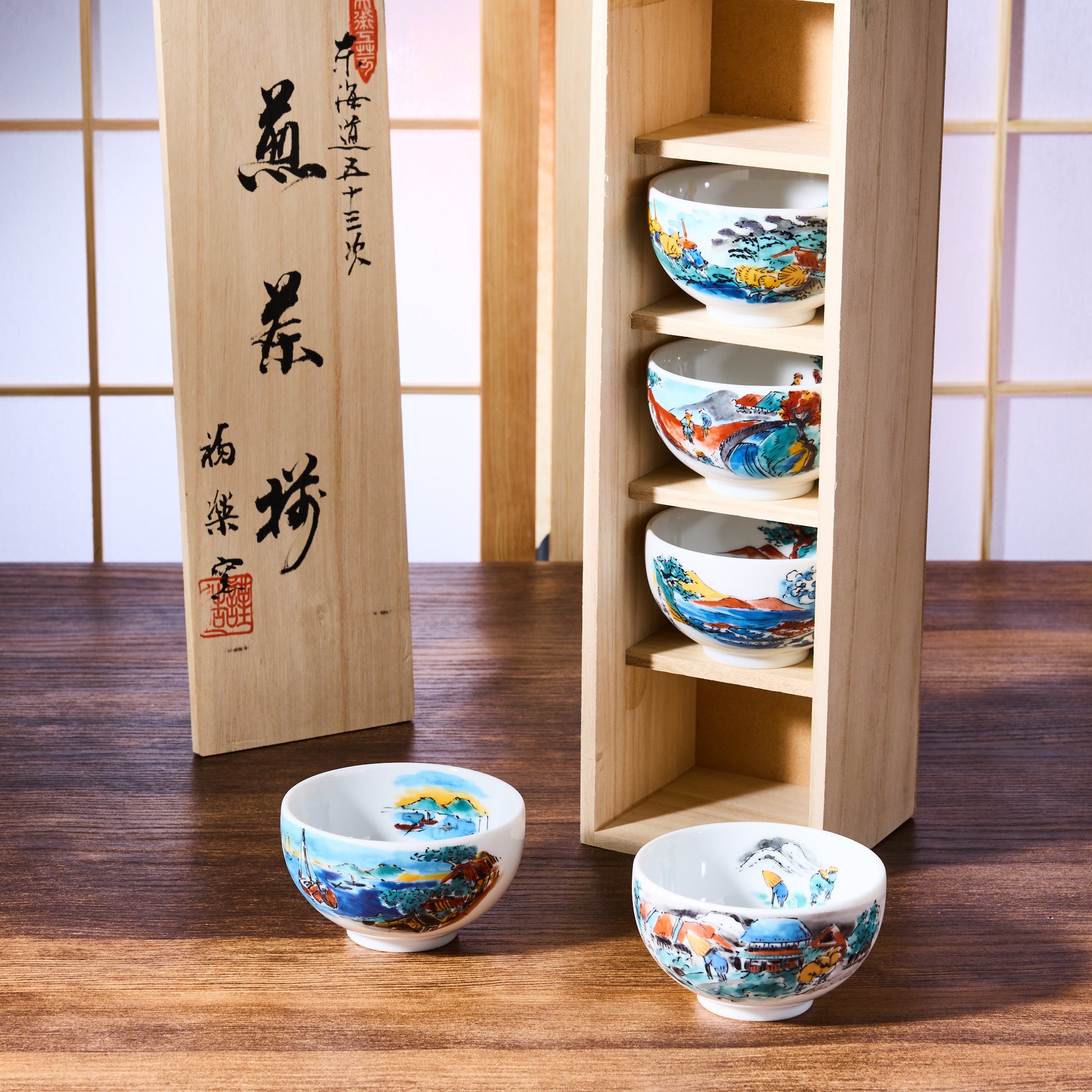 This sencha teacup set features five distinct sencha teacups, a type of ceramic specifically crafted for drinking sencha green tea. Each piece is inspired by a scene from the world-renowned Japanese artist Utagawa Hiroshige’s iconic The Fifty-Three Stations of the Tōkaidō ukiyo-e prints.