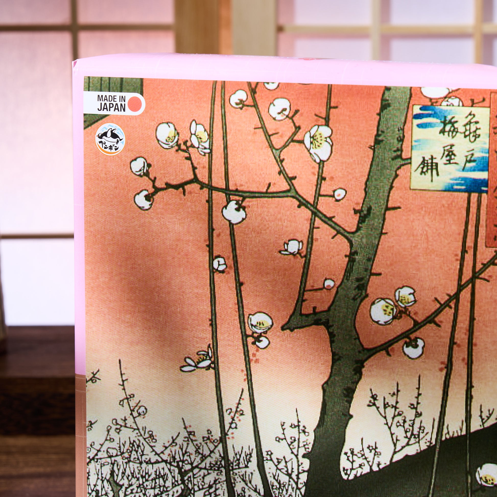 The package draws inspiration from Plum Garden at Kameido, an ukiyo-e woodblock print by the renowned Japanese artist Utagawa Hiroshige.