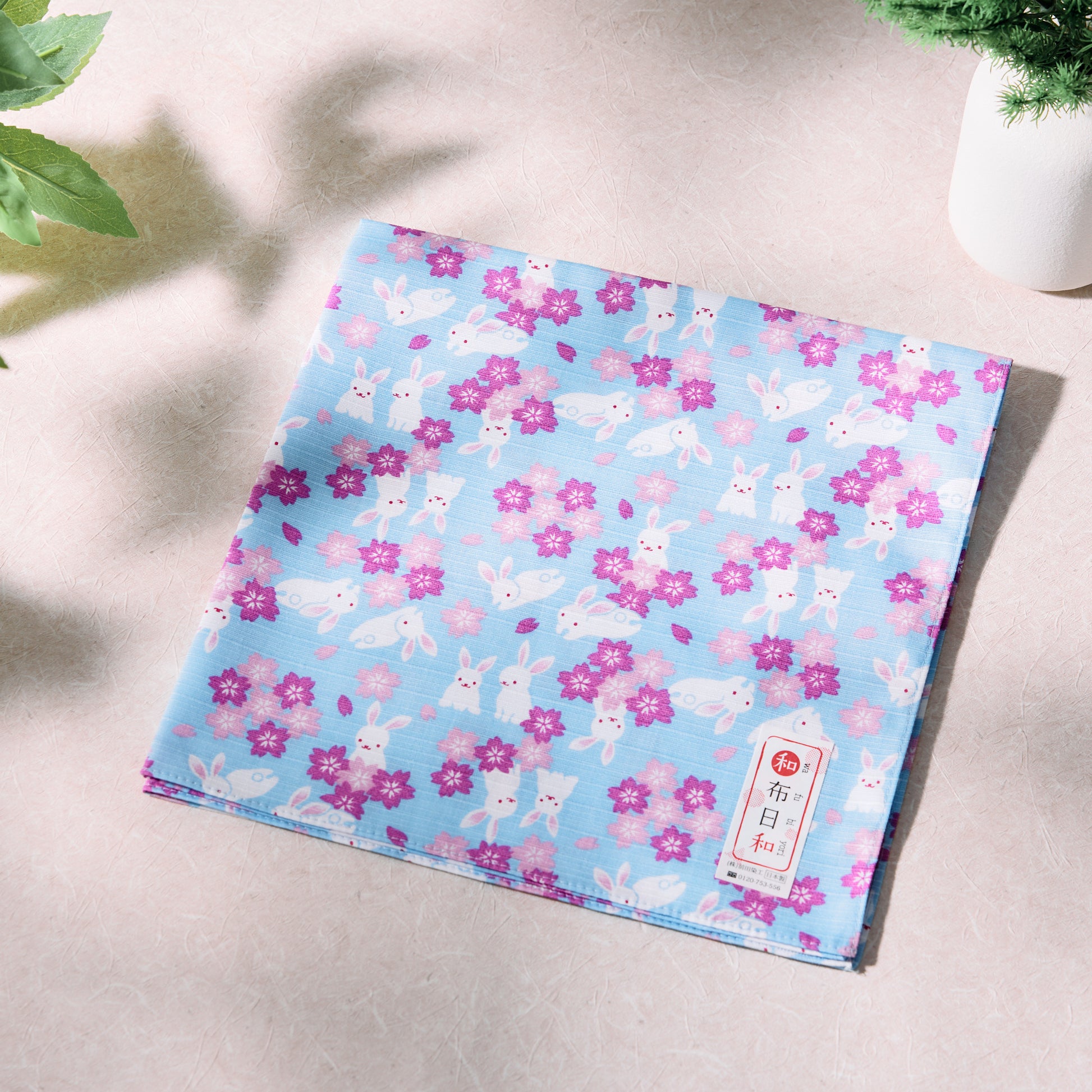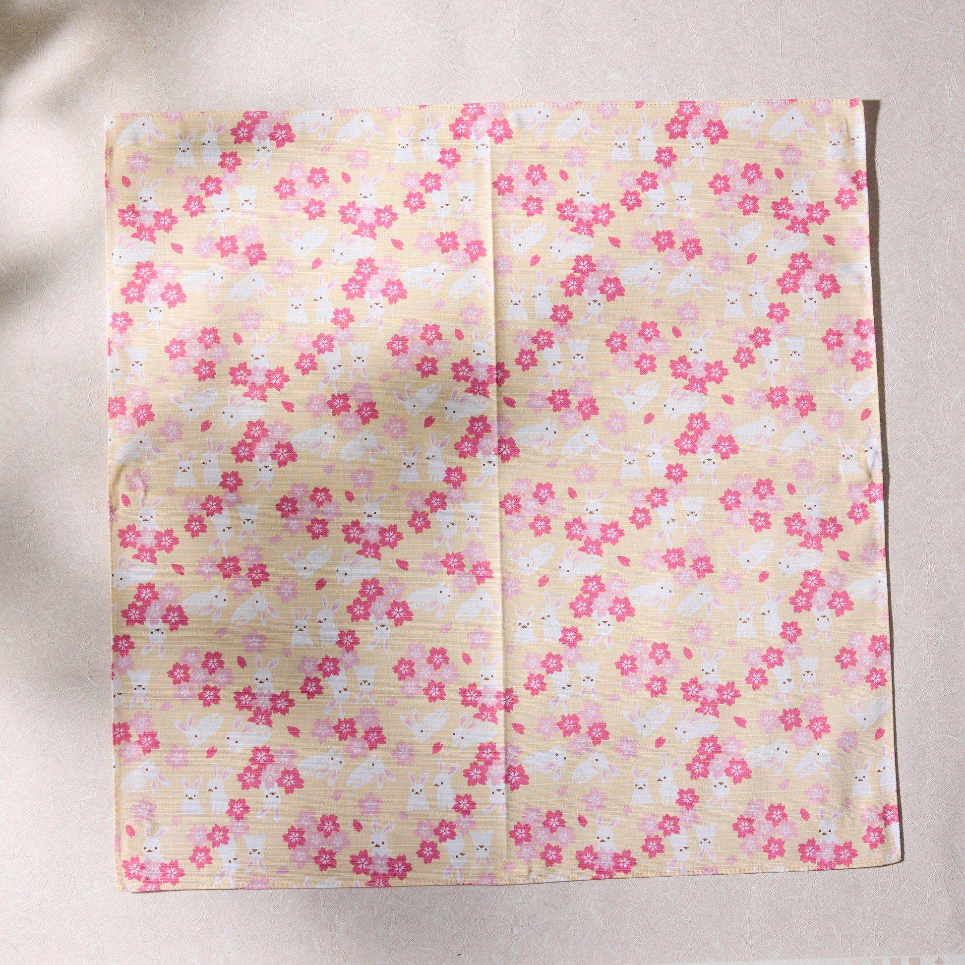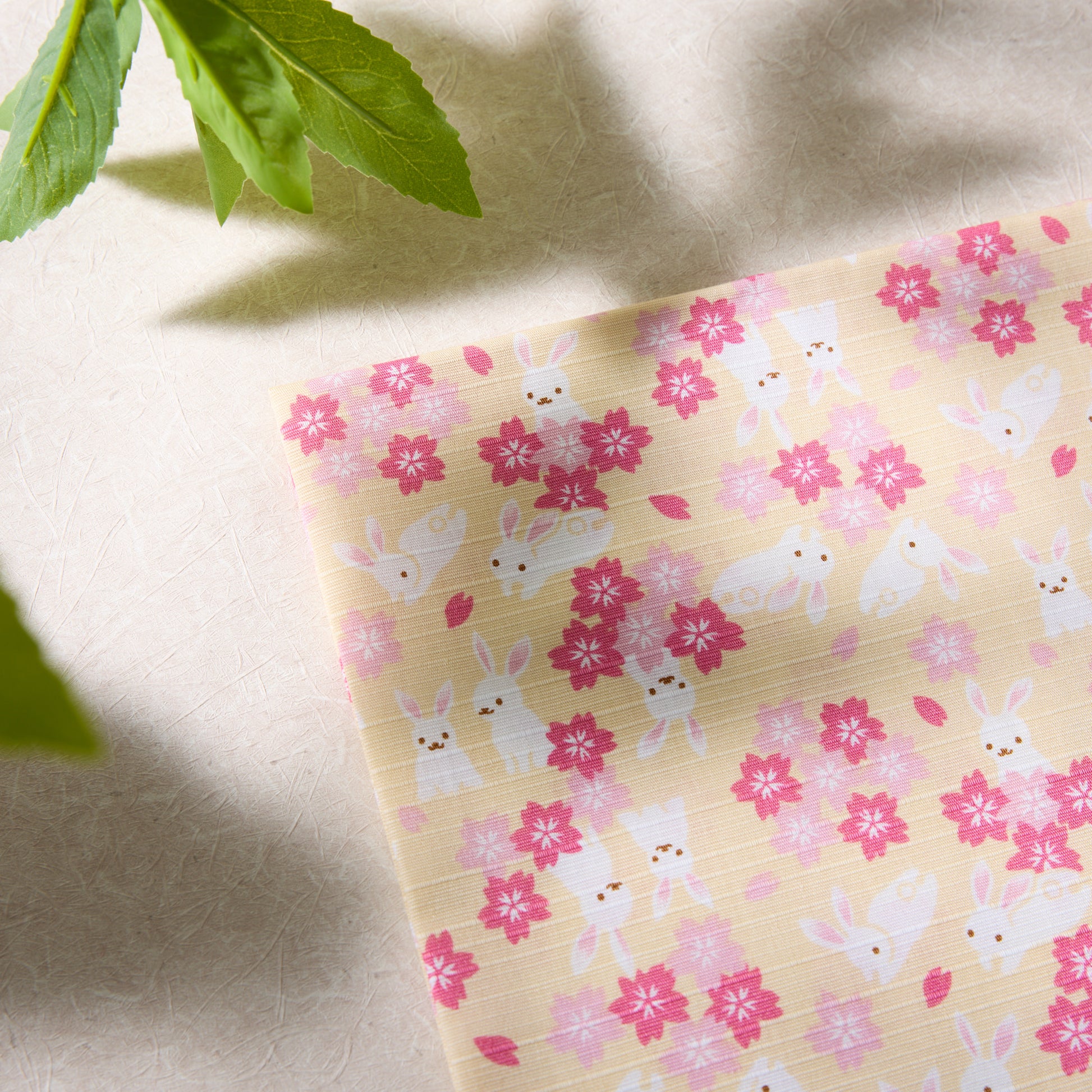 The charming pattern is dyed using the traditional kata yuzen method, where a stencil is used to apply the resist paste. The design features usagi and cherry blossoms, depicted in a lively style that adds a contemporary touch.