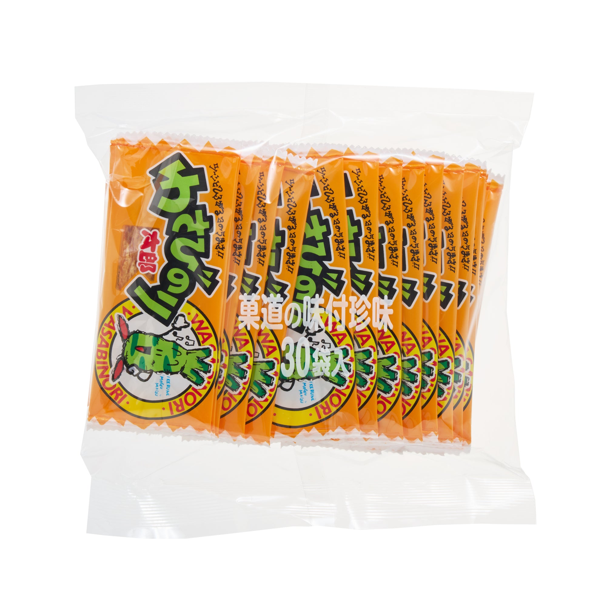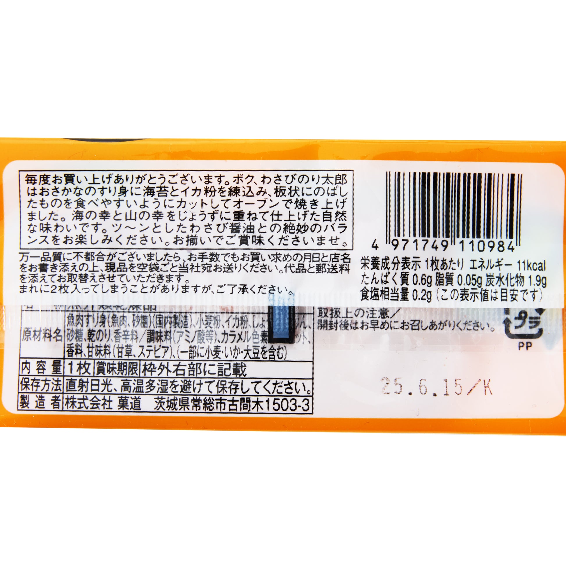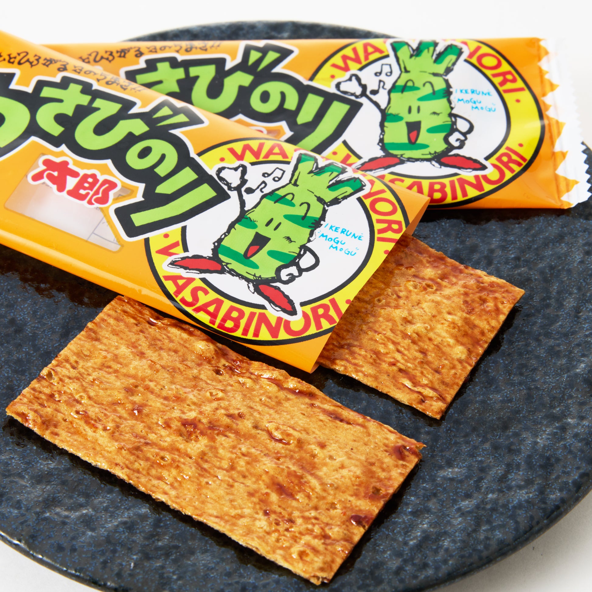 Enjoy the perfect fusion of bold wasabi and savory squid in this crispy dagashi snack. Wasabi delivers a sharp, spicy kick, while the rich umami flavor of squid balances the heat.