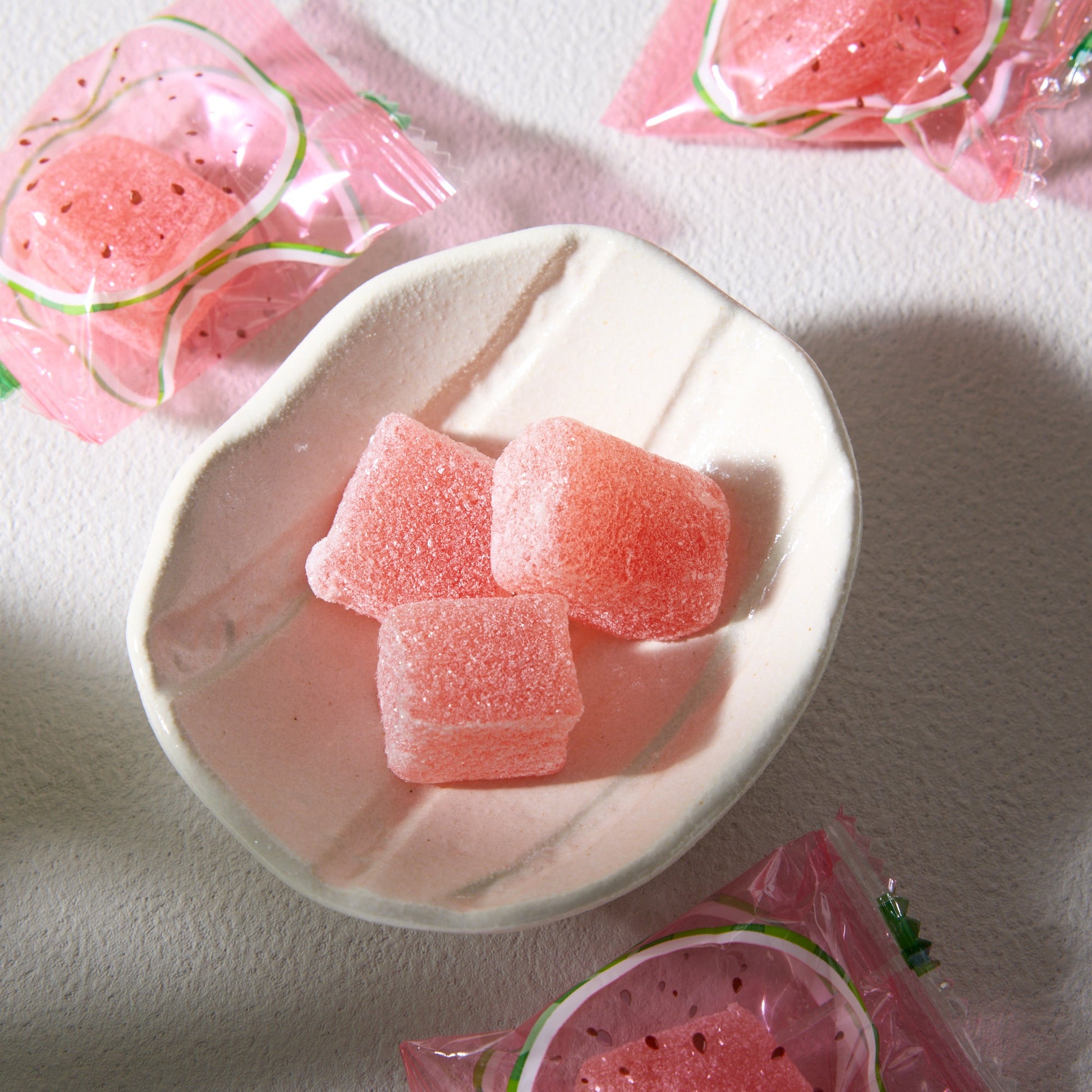 Embrace the refreshing taste of summer with Watermelon Candy, made with real watermelon juice for a bright, juicy flavor. Crafted with traditional Japanese agar agar, each piece has a smooth, delicate chew that melts gently on the tongue. Complete with colorful packaging, these charming treats capture the playful spirit of Japanese confectionery.