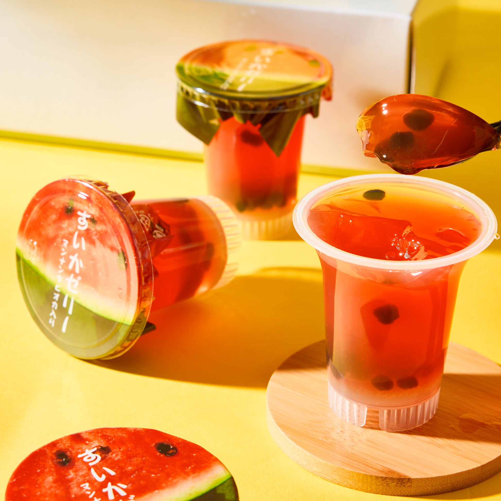 This light, fruit jelly blends mellow watermelon juice with a hint of lemon for a refreshing, subtly tart finish. Small konjac tapioca pearls—designed to resemble watermelon seeds—add a pleasant, chewy texture to each spoonful.