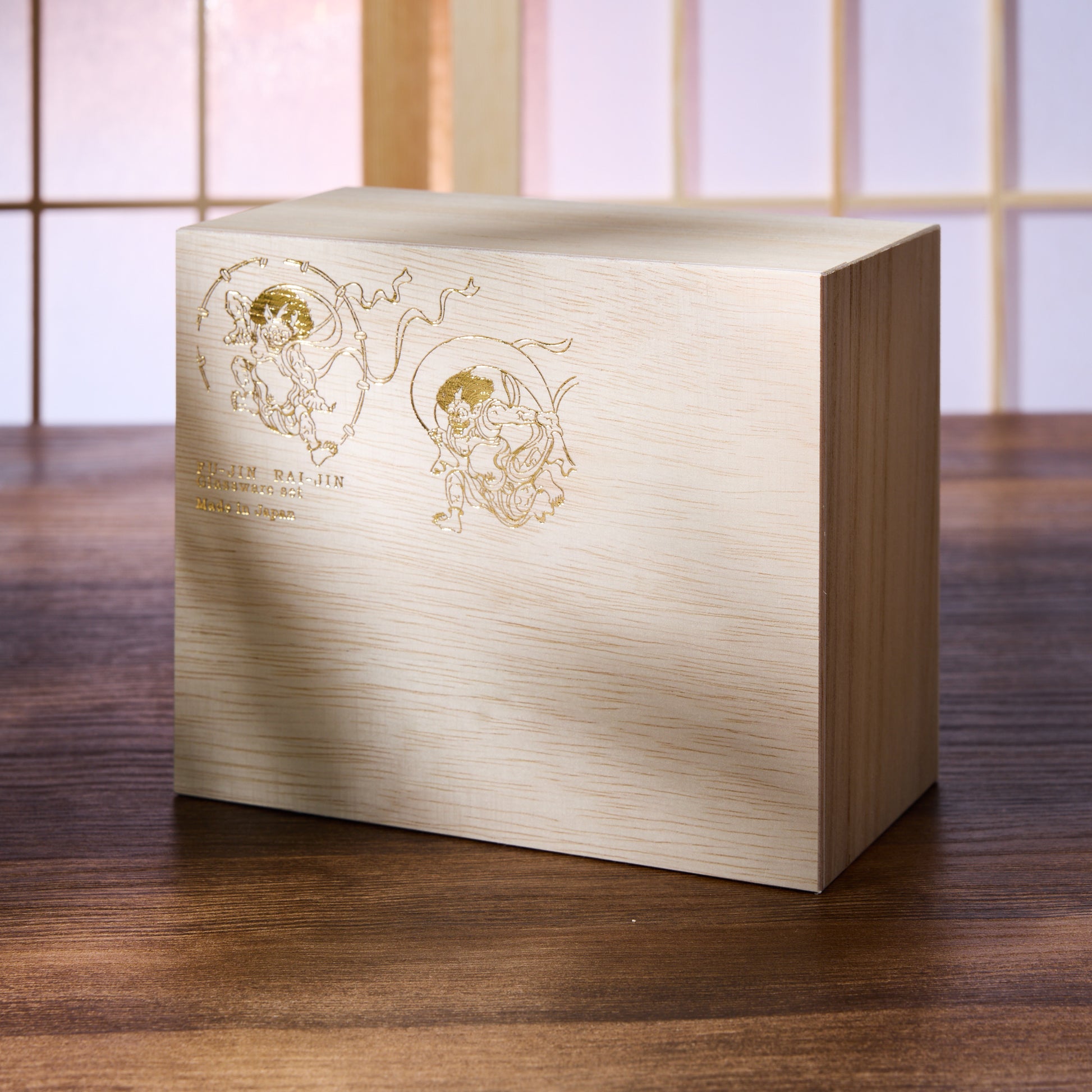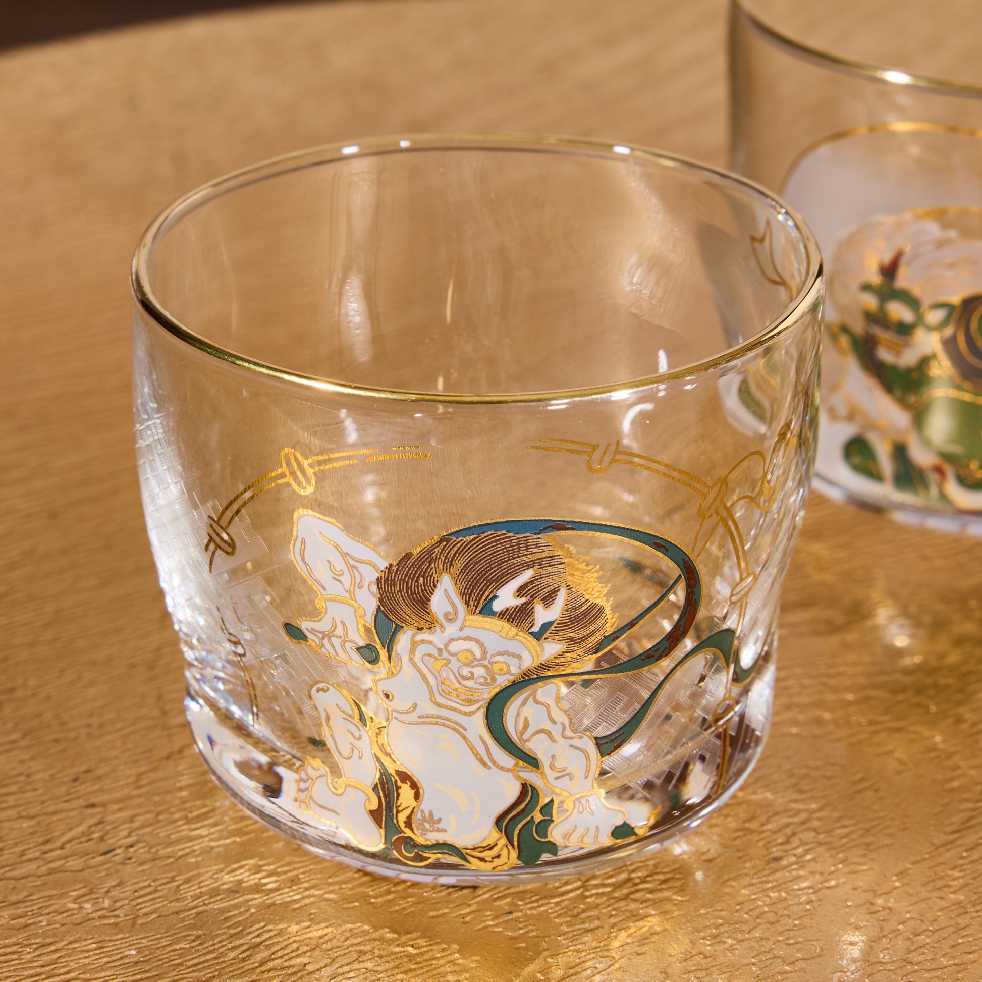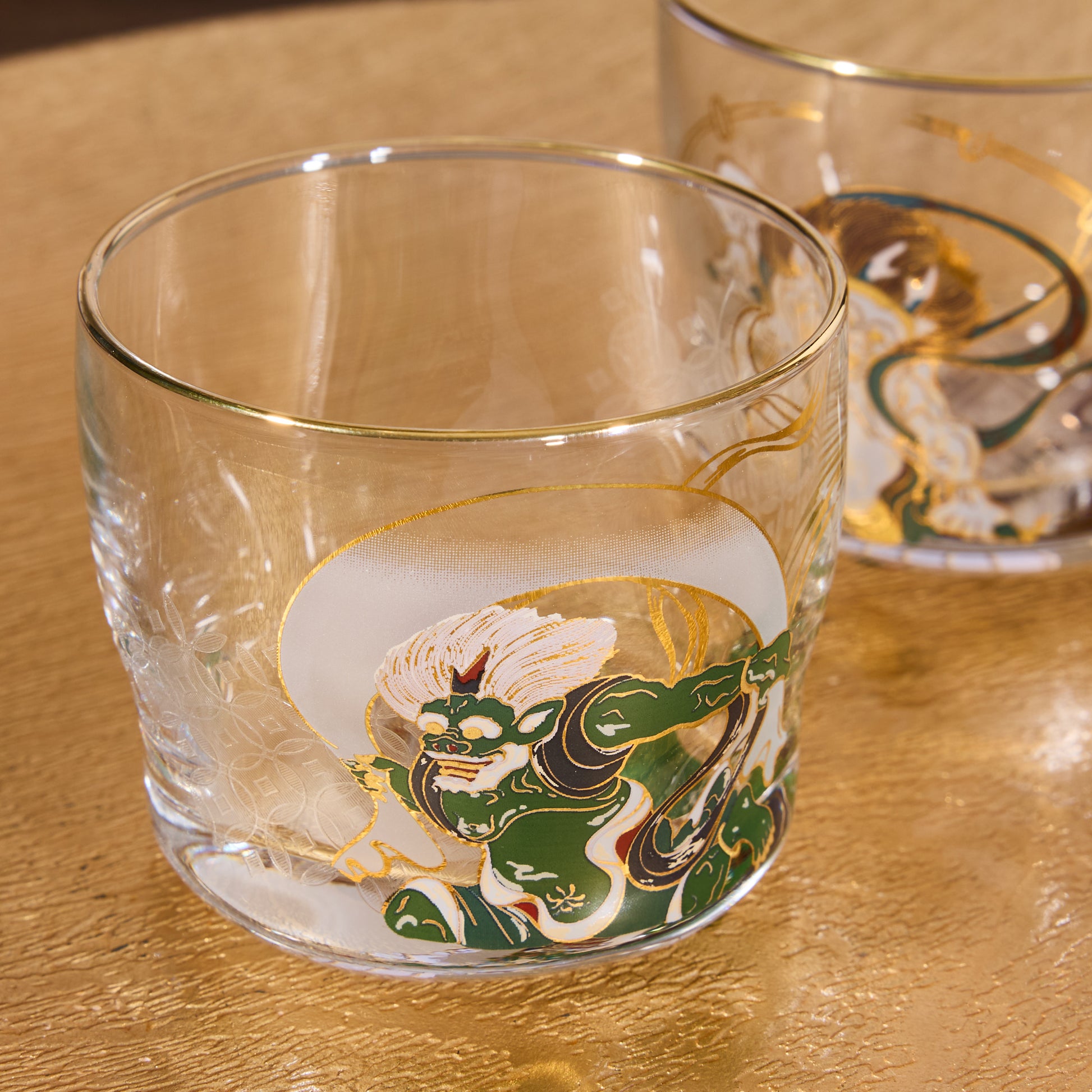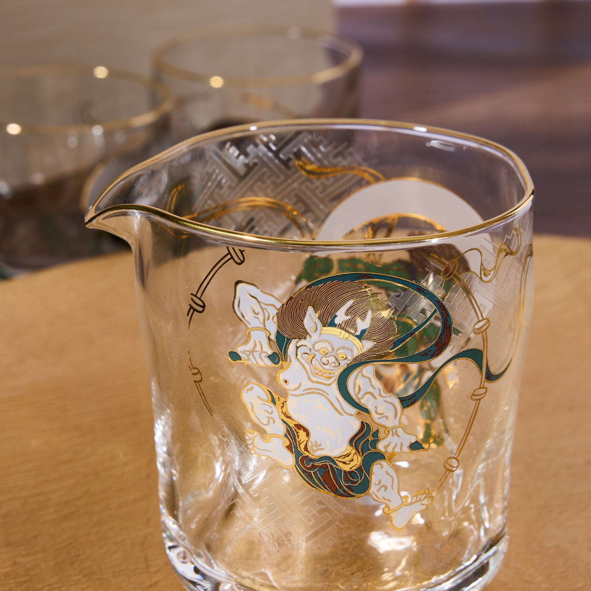 This glass sake set draws inspiration from the Wind God and Thunder God, which have been depicted in iconic Japanese art for centuries, notably by the celebrated artist Tawaraya Sotatsu. One cup features the Wind God, Fujin (風神), the other depicts the Thunder God, Raijin (雷神), while the sake server brings both together, completing the set. Delicate gold detailing along the rims adds a luxurious touch to the design.