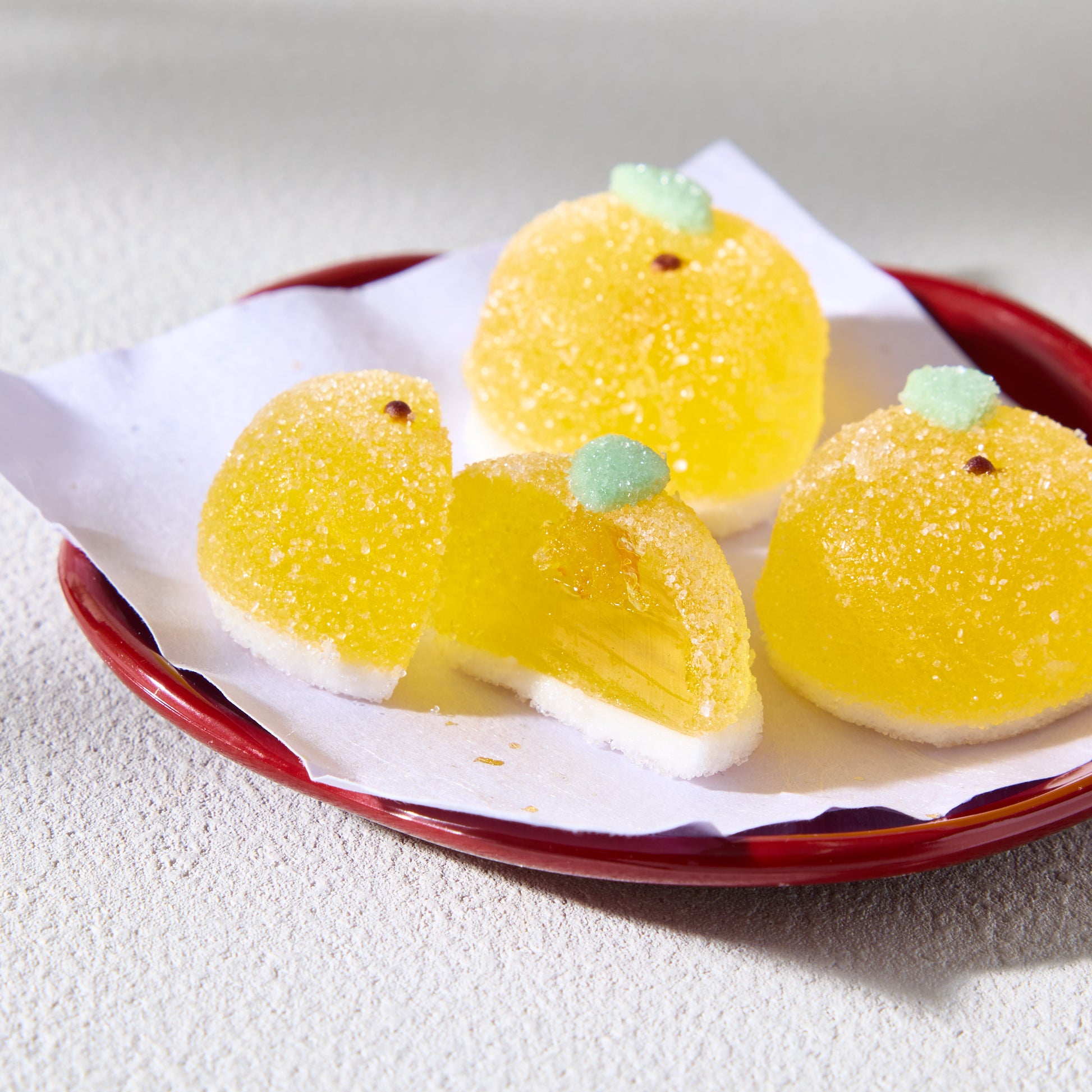Crafted to resemble real Japanese yuzu fruit, these delicately textured jellies capture the essence of Japan’s prized citrus. Infused with aromatic yuzu peels, each piece offers a harmonious blend of bright tartness and natural sweetness.