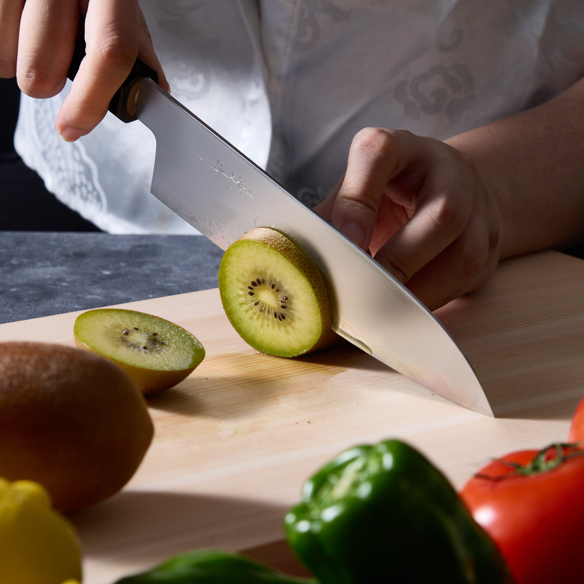 Steel: Crafted from Chromax steel, a high-performance alloy known for its exceptional balance of edge retention, durability, and corrosion resistance. This steel ensures long-lasting sharpness and dependable performance, making it ideal for both professional and home kitchens.
